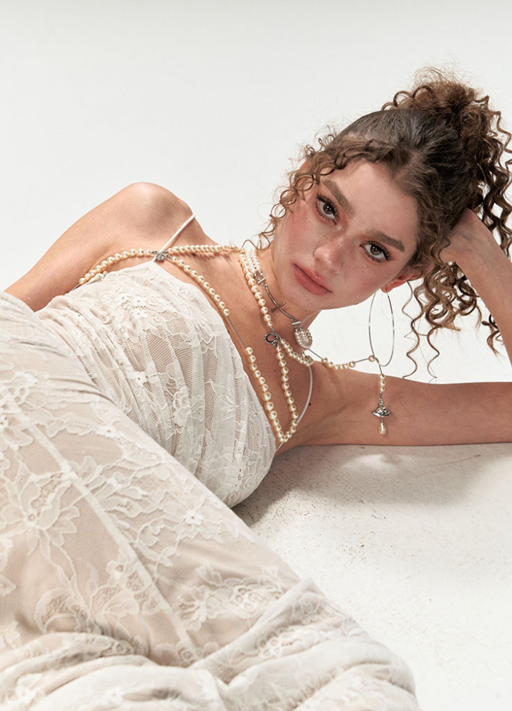 Woman White Sheer Lace Camisole Slim Long Dress CDR085